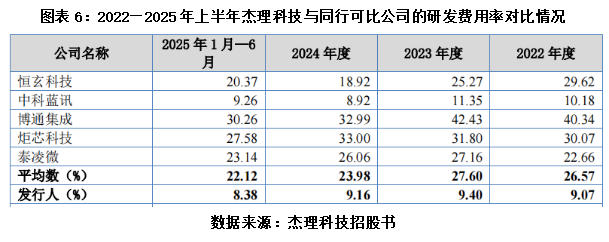 招股书的数据更能说明问题:2022年至2025年上半年,杰理科技的研发费用率分别为9.07%、9.40%、9.16%、8.38%,而同期同行可比公司的研发费用率均值分别达26.57%、27.60%、23.98%、22.12%,两者差距超1倍。由此可见,杰理科技研发投入力度显著不足,难以支撑其高端化转型。